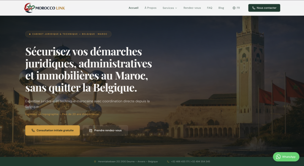 The platform connects clients with professional expertise in notarial services and technical engineering, providing a reliable bridge between Europe and Morocco. The project focuses on trust, clarity, and efficiency, offering a structured service experience for complex cross-border procedures.
