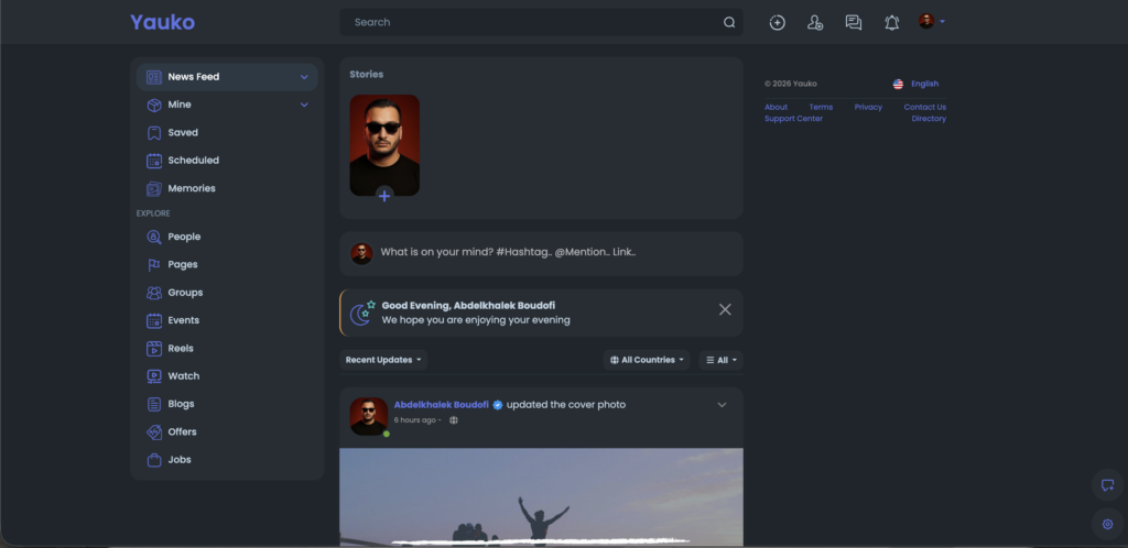 Yauko is a modern social media platform designed to create an interactive digital environment where users can share content, connect, and engage in real time. The platform includes features such as news feed, stories, profiles, groups, and content sharing, inspired by leading social ecosystems but built with a clean and scalable architecture.